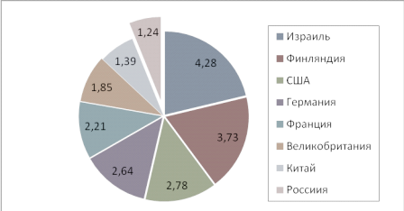 Поскольку ВВП рассматриваемых стран разительно отличаются, представим информацию в количественной форме. Затраты на исследования и разработки.: США - 385,8 млрд. долл., Китай - 141,4 млрд. долл., Германия - 83,5 млрд. долл., Россия - 22 млрд. долл.